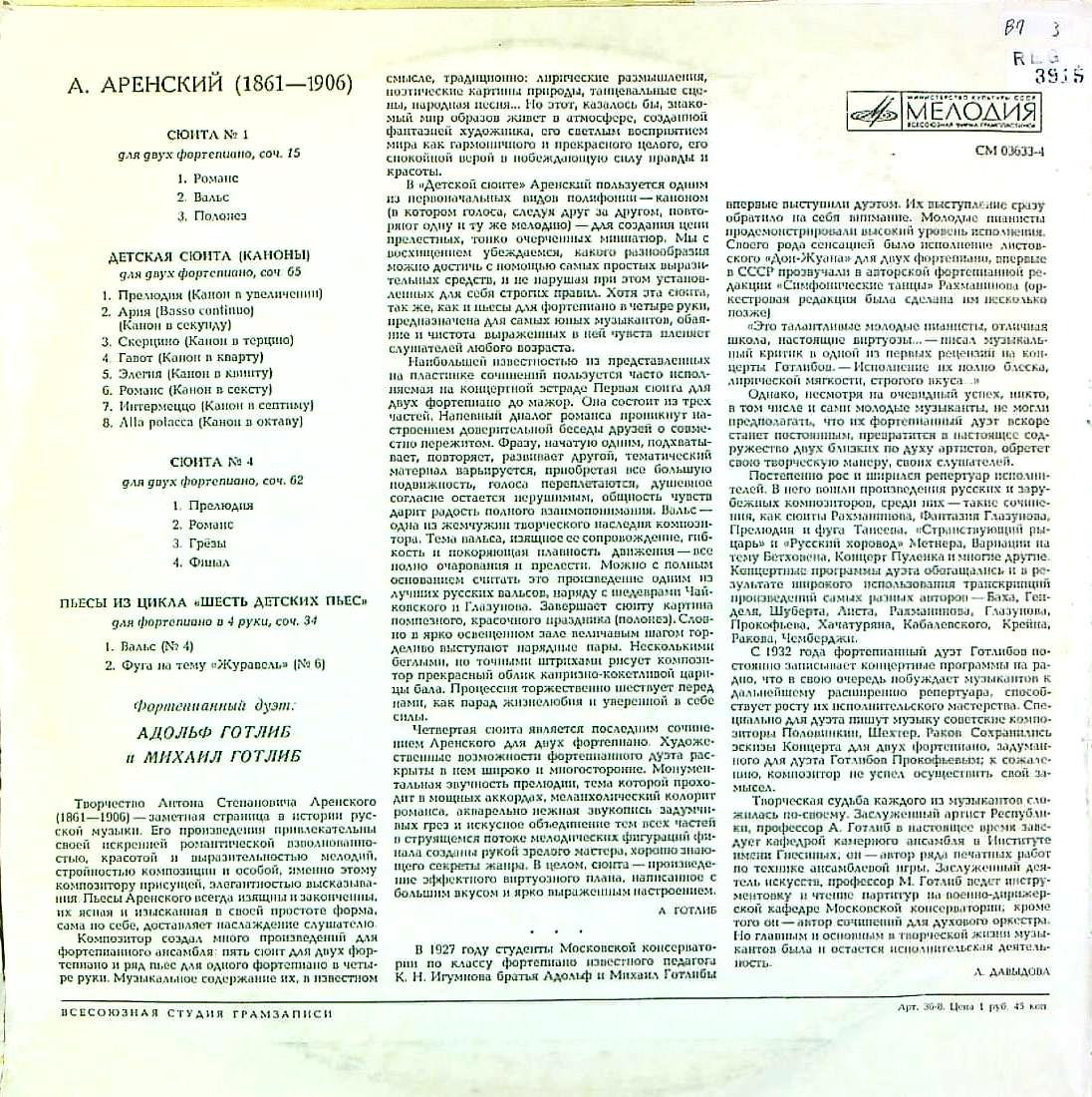 商品コード:REG-3915[露MELODIYA] A.ゴットリーブ, M.ゴットリーブ(pf) / アレンスキー: 2台Pfのための組曲1番, 4番 他