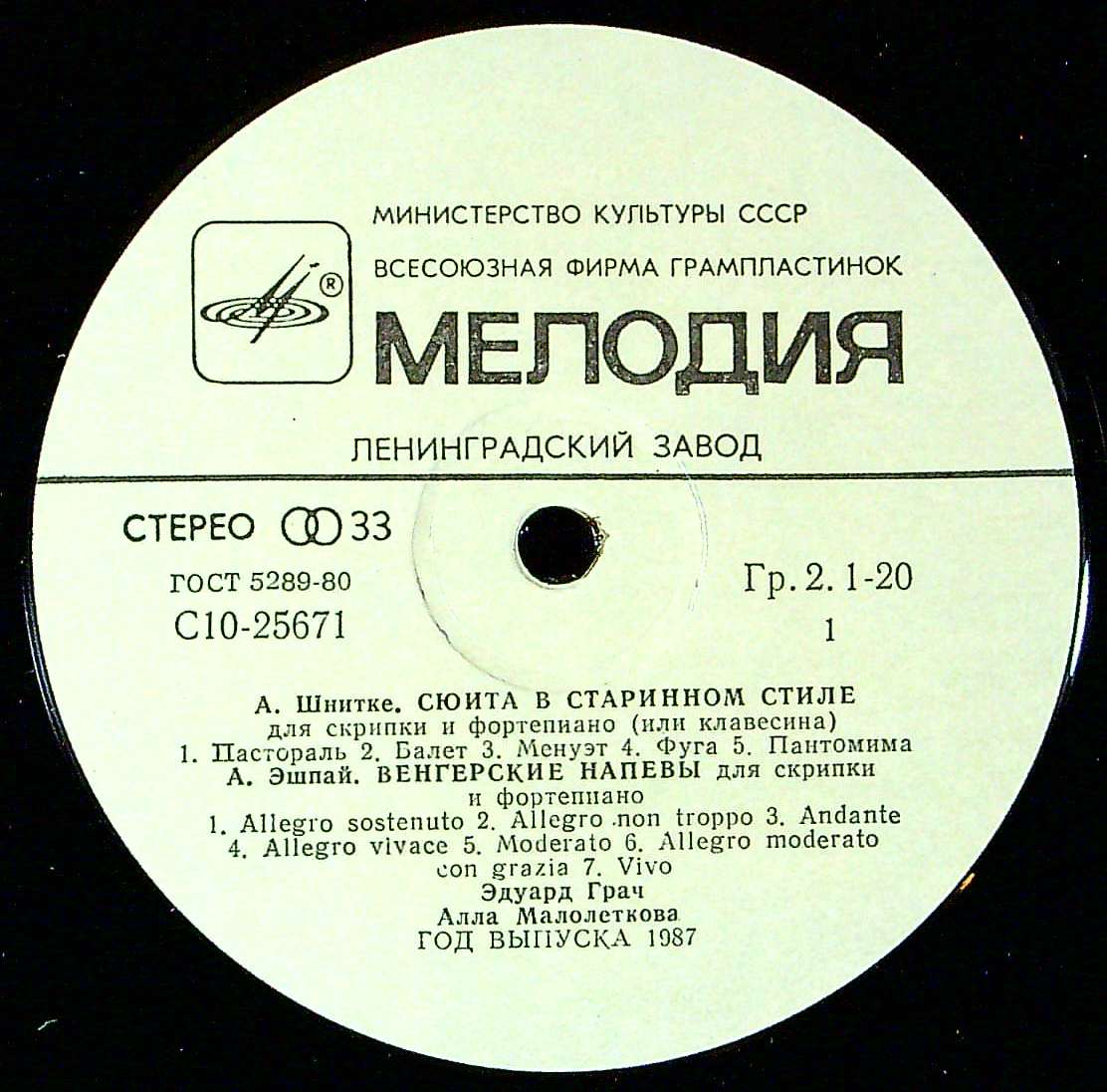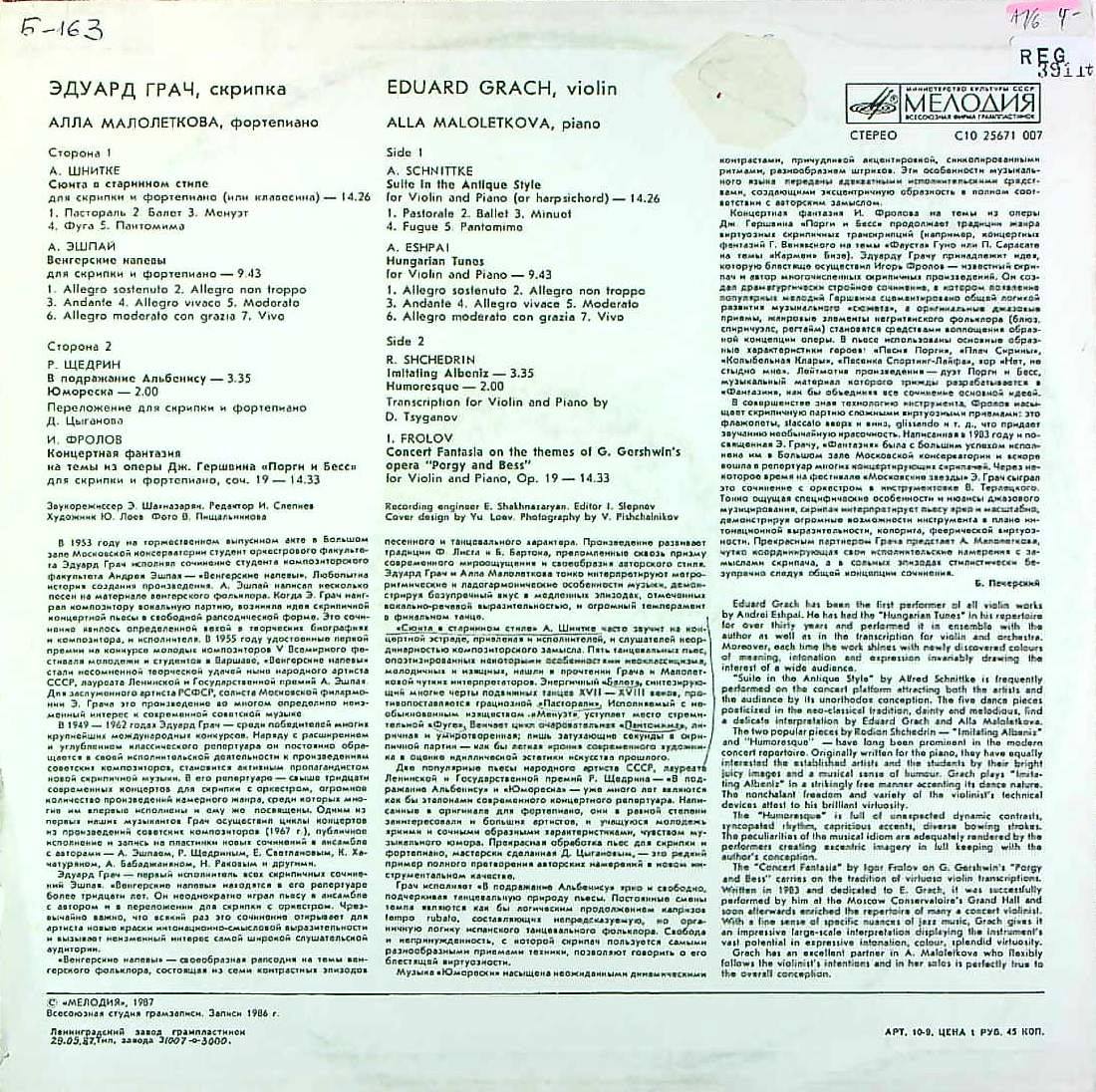 商品コード:REG-3911t[露MELODIYA] E.グラチ(vn)/ シュニトケ:古典的組曲, エシュパイ:ハンガリー小曲集 他