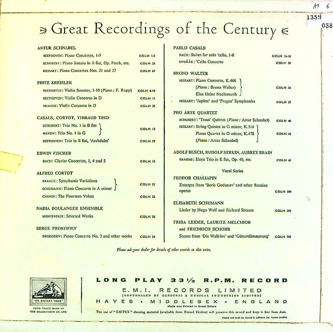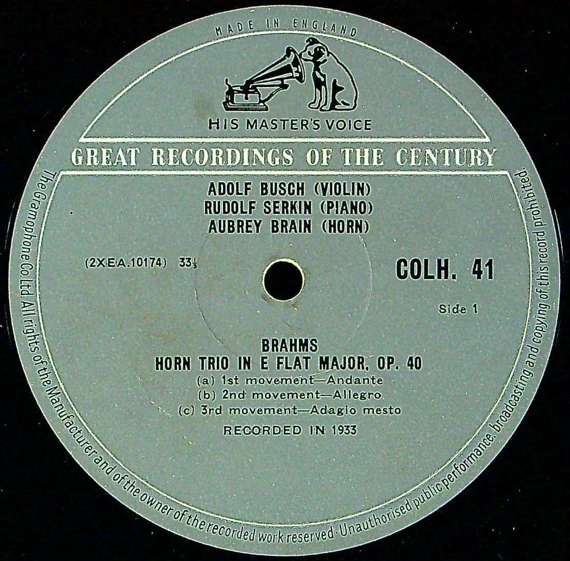 商品コード:1359-058[HMV] A.ブッシュ(vn) R.ゼルキン(pf) A.ブレイン(hr)/ ブラームス:Hrトリオ, Vnソナタ2番
