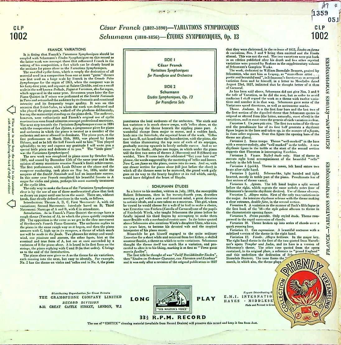商品コード:1359-051[HMV ] M.リンパニー(pf)/ フランク:Pfと管弦楽のための交響的変奏曲, シューマン:Pf独奏のための交響的練習曲