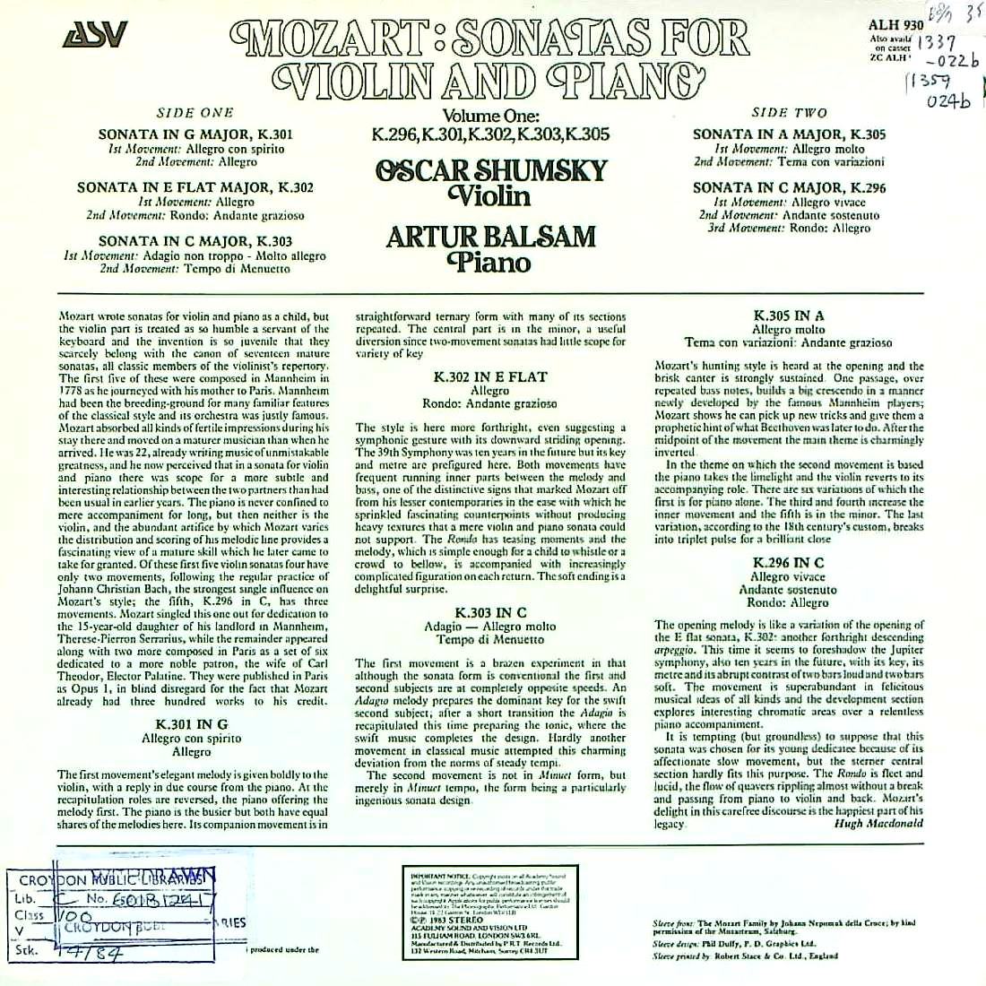 商品詳細:米MHS録音の英プレス。オスカー・シュムスキーは1917年米国生まれのロシア人。録音は少なく、特に'50年代は米ALLEGROなどに僅かしかない。近年バッハ無伴奏等で知られるようになったが、それは1980年代に入って英NIMBUS等に室内楽録音を入れ始めてからである。この録音も'80年代初期。欧州では英ASVからバラで発売されている。「遅咲きのヴァイオリニスト」と呼ばれる古参奏者の晩年録音。音も綺麗で、含蓄に富んだ表現と抑えた表情。第一級の内容!米国ではMHSレーベルからMHS 3475-80の箱入り6枚組で発売された。これはその英国プレス。英国ではASVレーベルからバラ6枚で発売されたと思われるが、これまで2枚しか見てない。1978年またはそれ以前の録音と思われる。シュムスキーの個性が発揮されたナイーヴな演奏で悪くない。よく弾むスタイルでモーツァルトらしさが溢れる演奏!英国盤の発売は1983年頃だが録音がデッドだったことが幸いしてかエコー分のほどんどない非常に良い音が出て来る。英国盤で聴けばぴったりとバランスが整い、素晴らしい全集となるだろう。但し英国盤をバラで集めるのは苦労すると思われる。ASVは Academy Sound and Vision.の略で1981 年 3 月に設立されたロンドンに本拠を置くレコードレーベル。DECCA、ARGO等の幹部によって創設された。