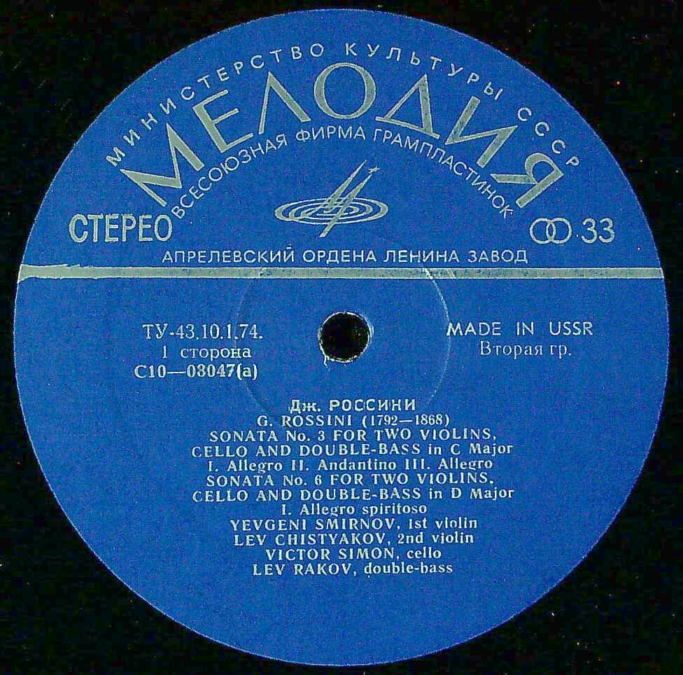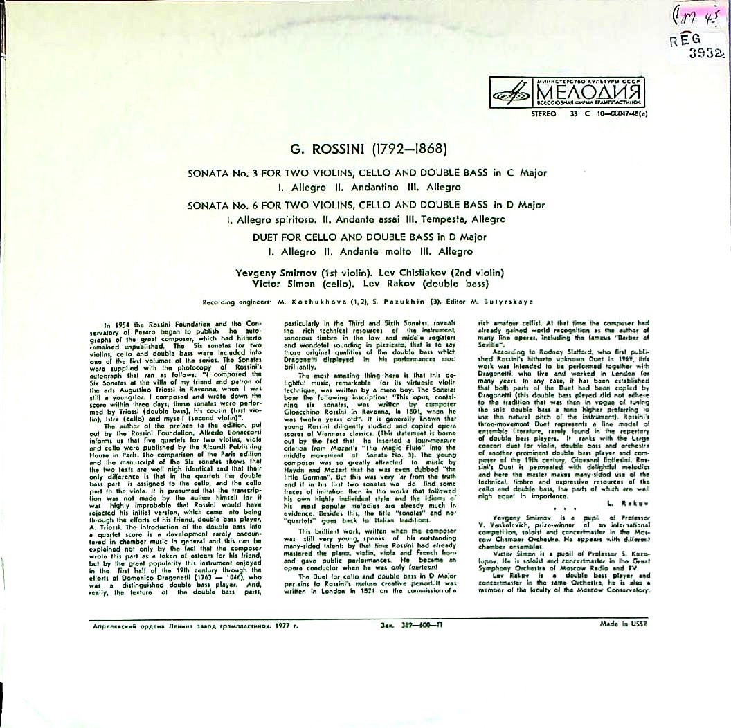 商品コード:REG-3932t[露MELODIYA] L.チスティアコフ , E.スミルノフ(vn) 他/ ロッシーニ:2Vn・Vc・Cbのためのソナタ3番, 6番, Vc・Cbのための二重奏曲