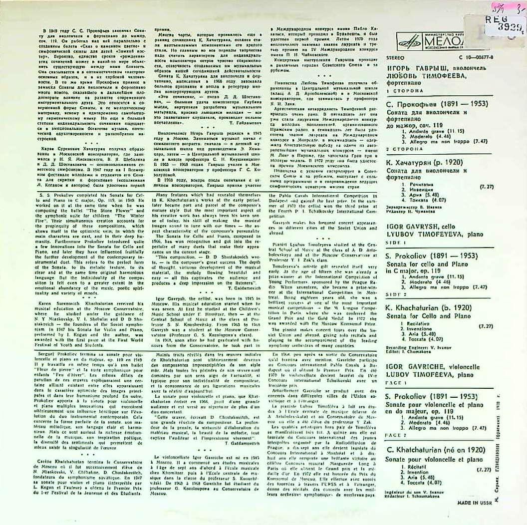 商品コード:REG-3929t[露MELODIYA] I.ガヴリュシュ(vc)/ プロコフィエフ:Vcソナタ, ハチャトゥリアン:Vcソナタ