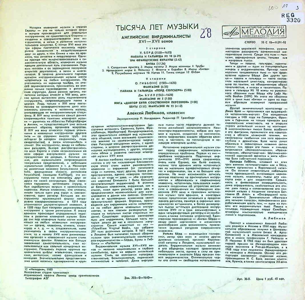 商品コード:REG-3920[露MELODIYA] A.リュビモフ(cemb) / 「16-17世紀の英国ヴァージナリスト達」バード, ギボンズ, ブル 他