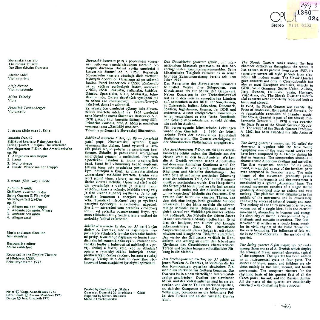 商品コード:1360-024t[OPUS] スロバキアQt. / ドヴォルザーク:弦楽四重奏曲12番「アメリカ」, 10番