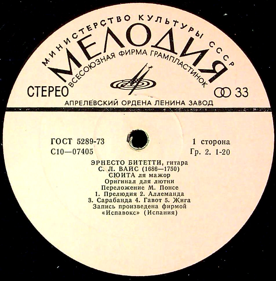 商品コード:REG-3954t[露MELODIYA] E.ビテッティ(gt) / ヴァイス:組曲イ長調, バッハ:無伴奏Vc組曲6番B.1012(Gt版)