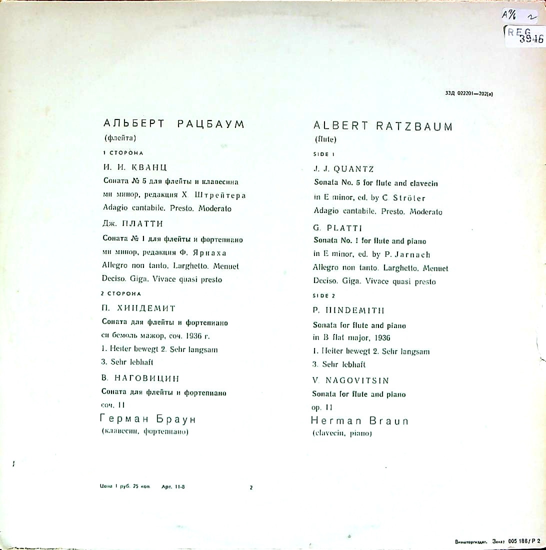 商品コード:REG-3946[露MELODIYA] A.ラッツバウム(fl)/ 「Flソナタ集」クヴァンツ, プラッティ ヒンデミット, ナゴヴィツィン
