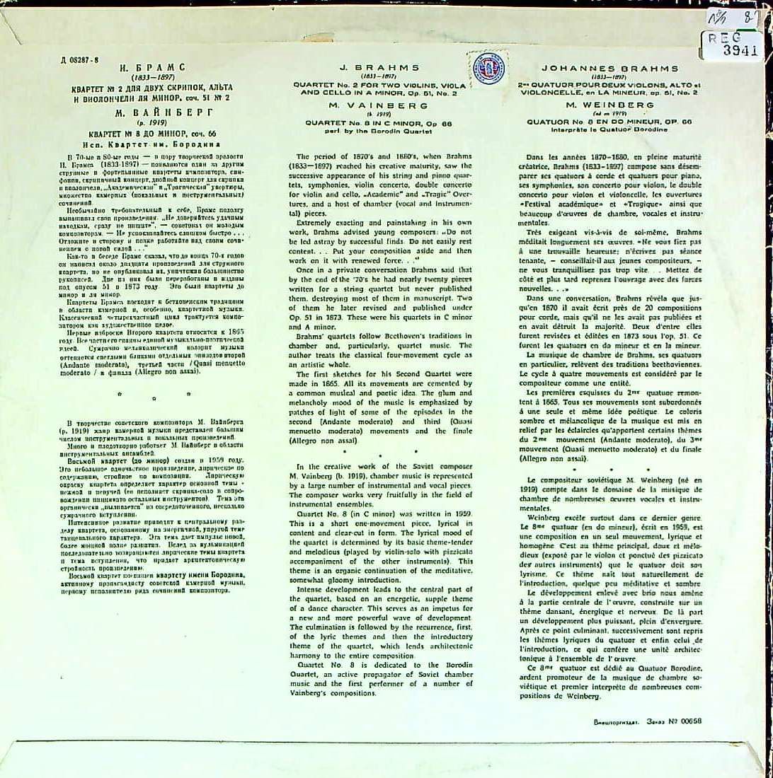 商品コード:REG-3941[露MELODIYA] ボロディンQt. / ブラームス:弦楽四重奏曲2番, ヴァインベルク:弦楽四重奏曲8番