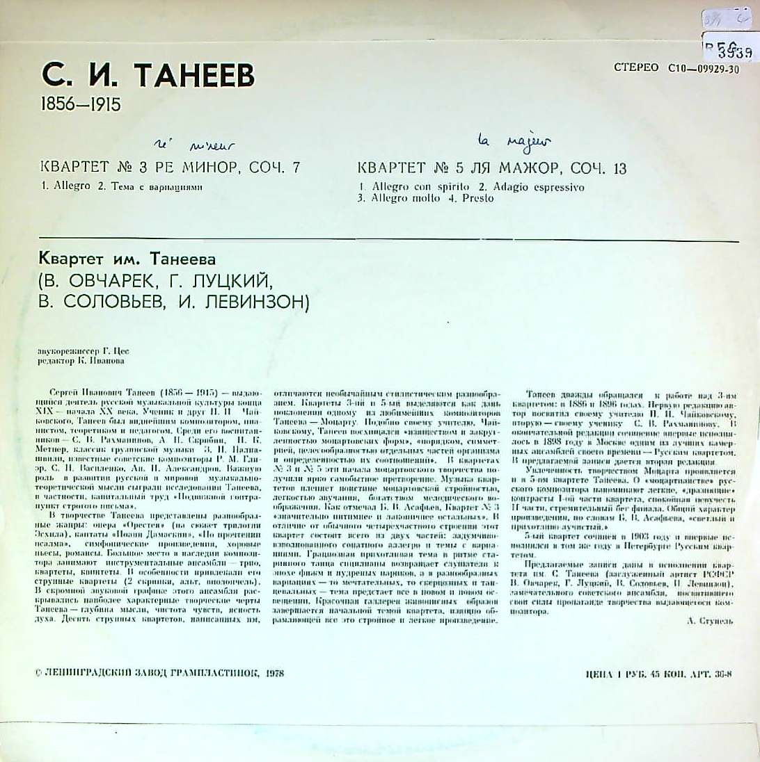 商品コード:REG-3939[露MELODIYA] タニェエフQt. / タニェエフ:弦楽四重奏曲3番, 5番