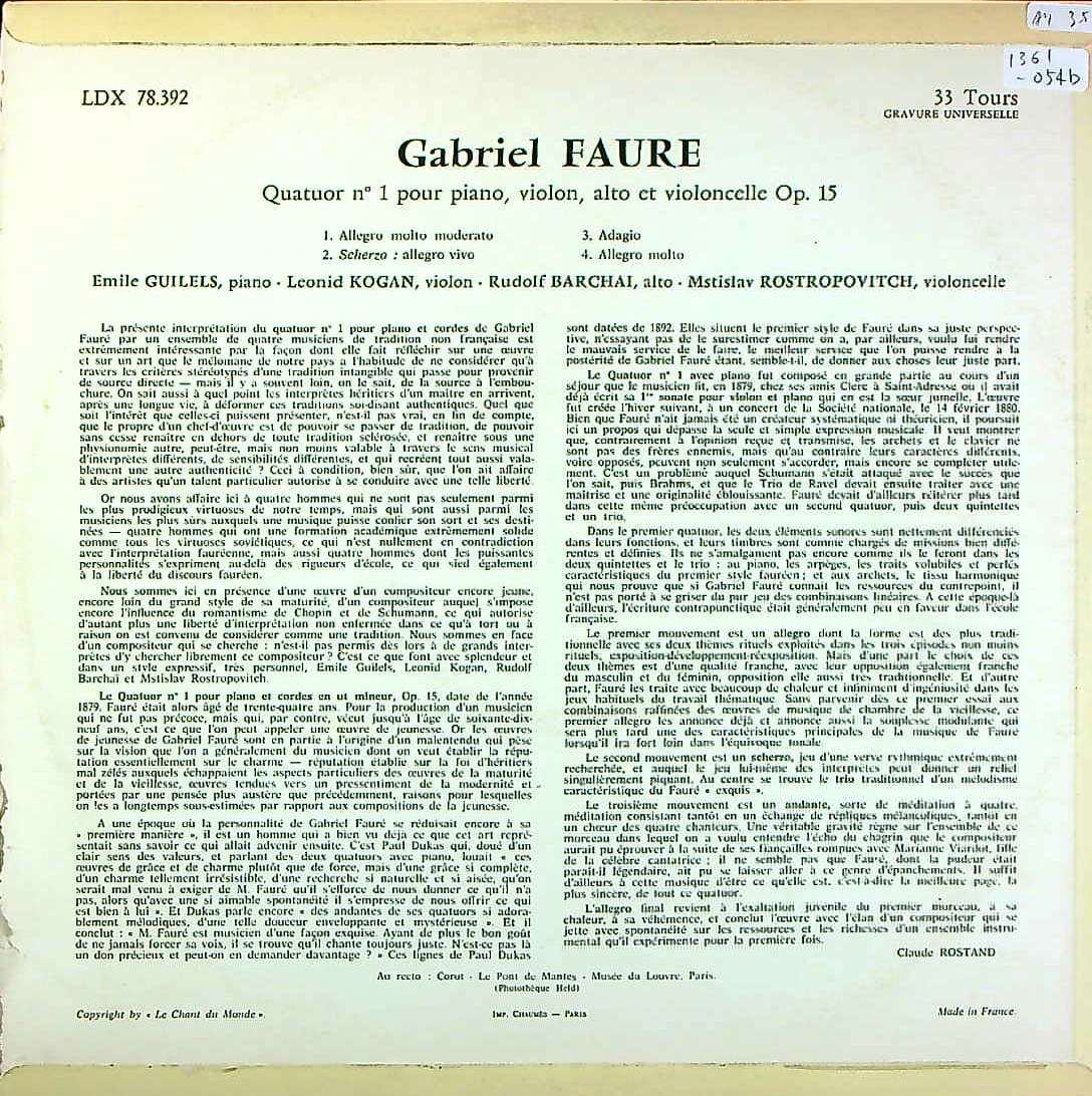商品コード:1361-054b[Chant du Monde] ギレリス, コーガン,.バルシャイ, ロストロポーヴィチ/ フォーレ:Pf四重奏曲1番