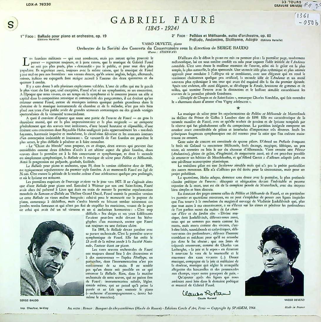 商品コード:1361-050b[Chant du Monde] V.デヴェツィ(pf)/ フォーレ:Pfと管弦楽のためのバラード, 組曲「ペレアスとメリザンド」