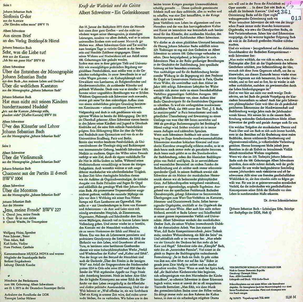 商品コード:1361-013t[ETERNA] K.ズスケ(vn)/ D.クノーテ/ 1975シュヴァイツァー記念コンサート/バッハ:カンタータB.75, B.85, B.211(各抜粋) 他