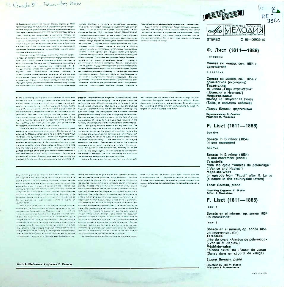 商品コード:REG-3964[露MELODIYA] L.ベルマン(pf) / リスト:Pfソナタ ロ短調, 巡礼の年~タランテラ 他