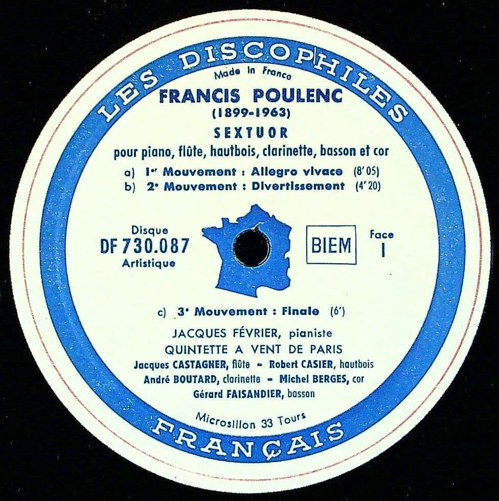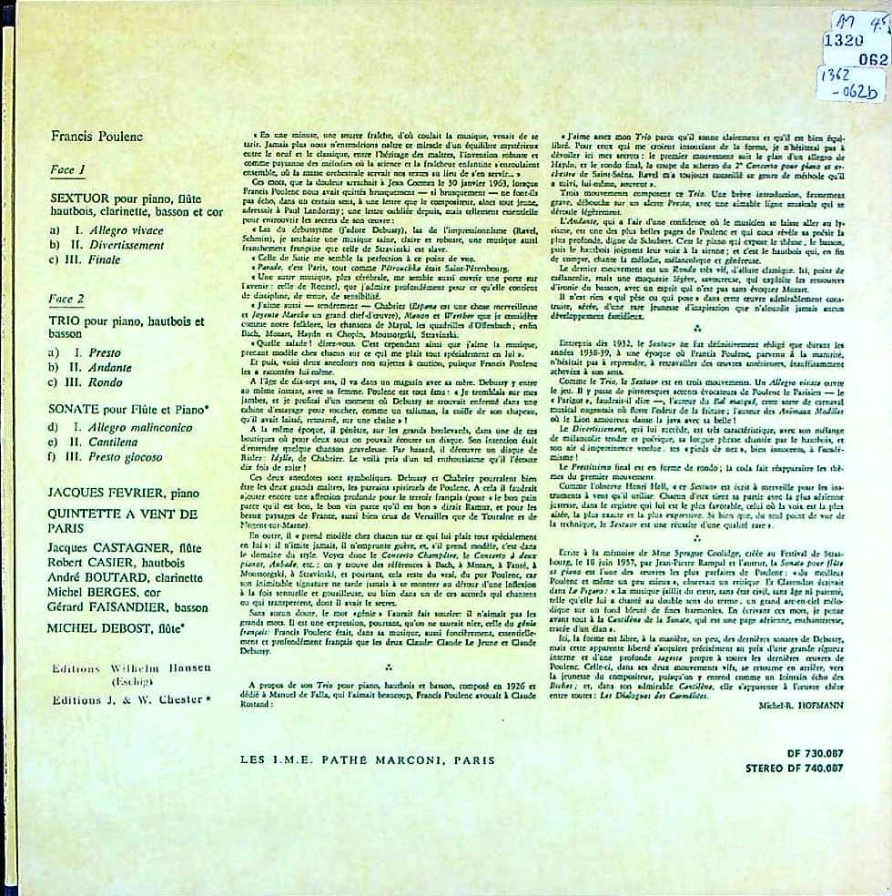 商品コード:1362-062b[DF] J.フェヴリエ(pf) M.デュボスト(fl) パリ管楽五重奏団/ プーランク:六重奏曲, Pf・Ob・Fgのための三重奏曲, Flソナタ