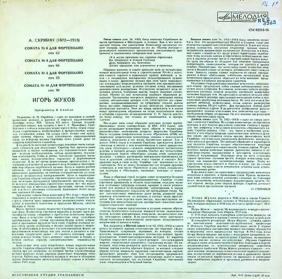 商品コード:REG-3983[露MELODIYA] I.ジューコフ(pf) / スクリャービン:Pfソナタ5, 6, 8, 10番