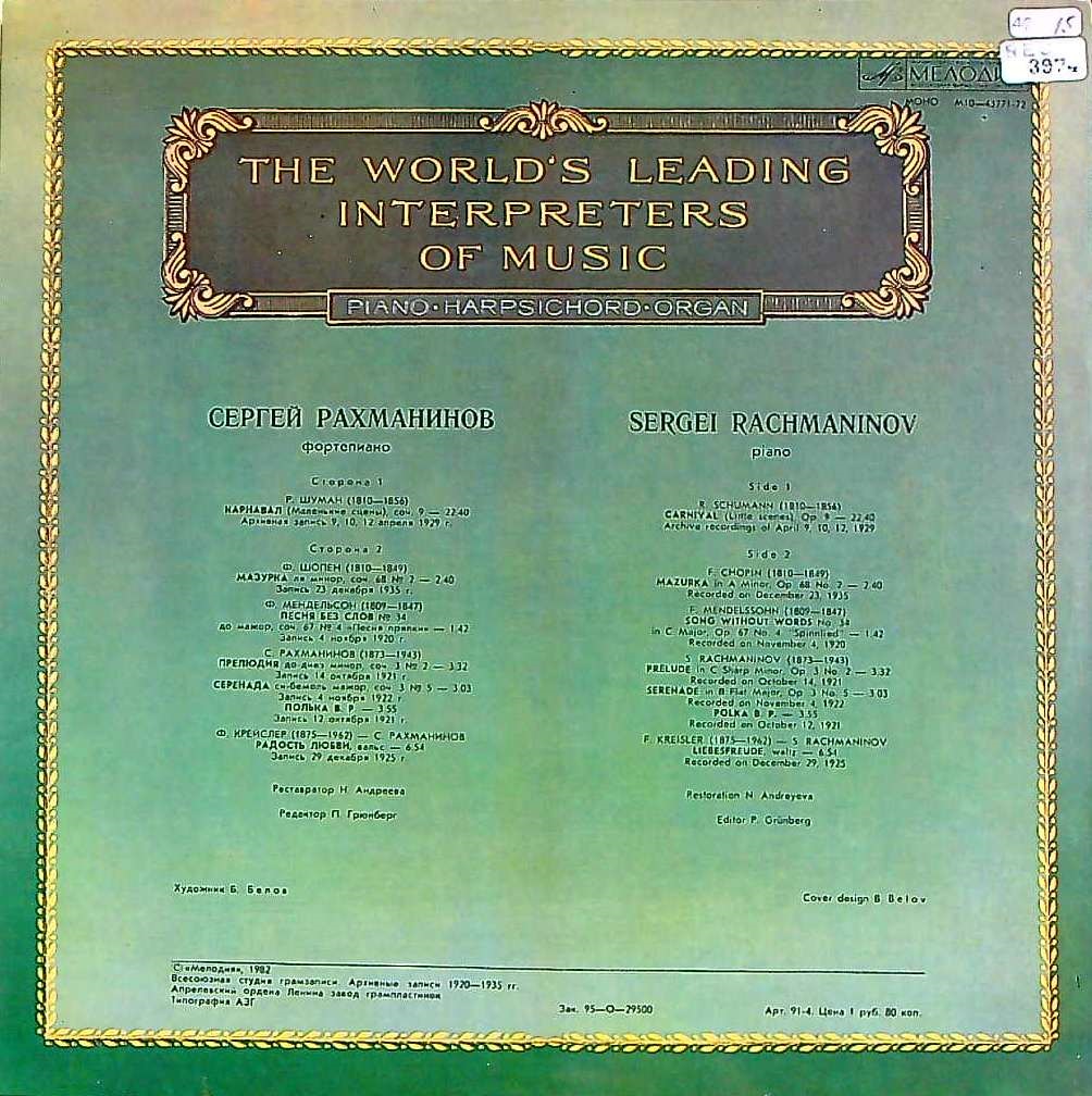 商品コード:REG-3974[露MELODIYA] S.ラフマニノフ(pf) / シューマン:謝肉祭, ショパン:マズルカ, メンデルスゾーン無言歌~「紡ぎ歌」 他