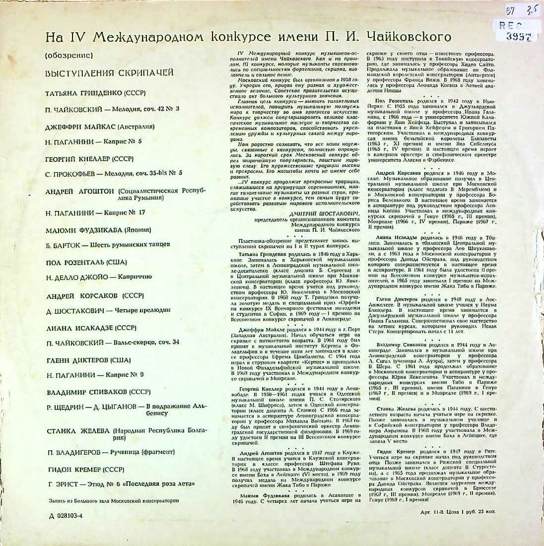 作品名:「第4回チャイコフスキー国際コンクール(Vn部門)」チャイコフスキー, パガニーニ, P.チャイコフスキー, プロコフィエフ, バルトーク, デッロ・ジョイオ, パガニーニ, ツィガノフ, シチェドリン, ヴラディゲーロフ, エルンスト