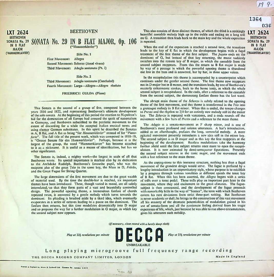 商品コード:1364-036[DECCA] F.グルダ(pf) / ベートーヴェン:Pfソナタ29番「ハンマークラヴィーア」