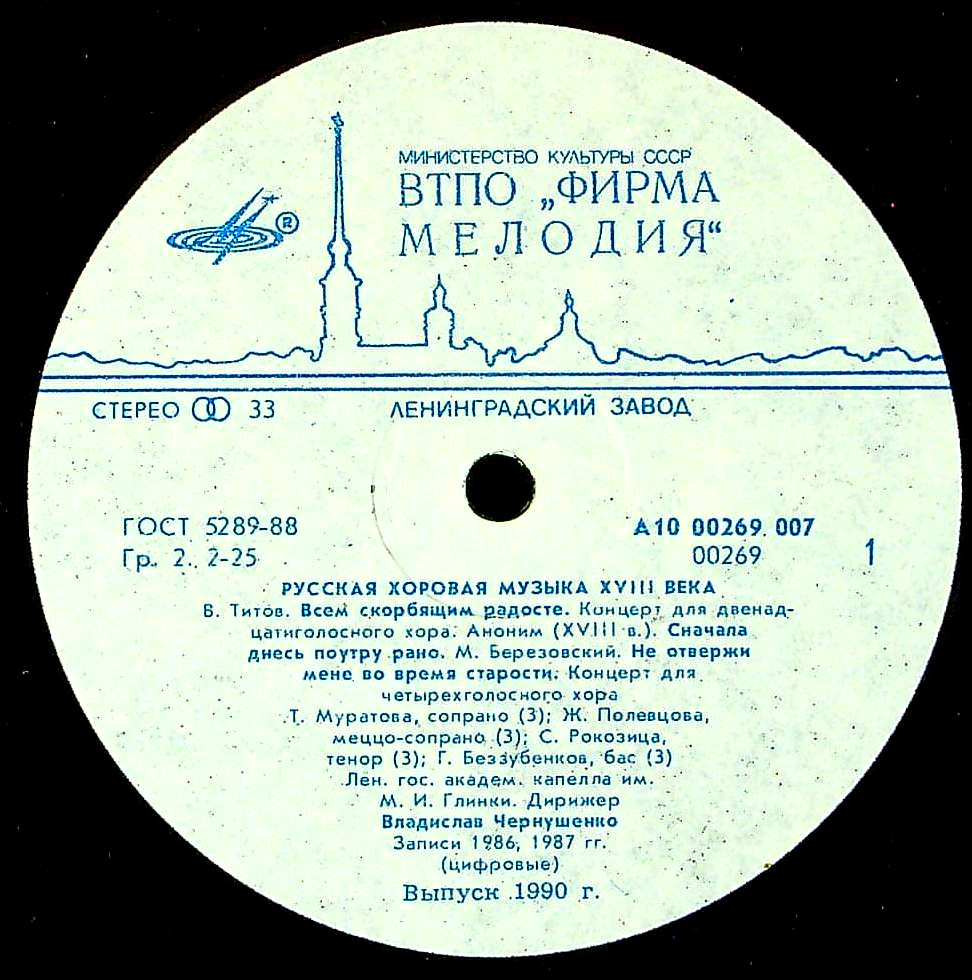 作品名:「18世紀ロシアの合唱曲」ティトフ:喜べ、すべての悲しむ者らよ(12声のための協奏曲), 不詳:今日は朝早くに, ベレゾフスキ:老いても私を拒絶しないで(4声のための協奏曲), ヴェーデリ:今、私たちは解放された, ボルトニャンスキー:ケルビック讃美歌7番(3曲), われら神をたたえよ(2つの合唱のための協奏曲)