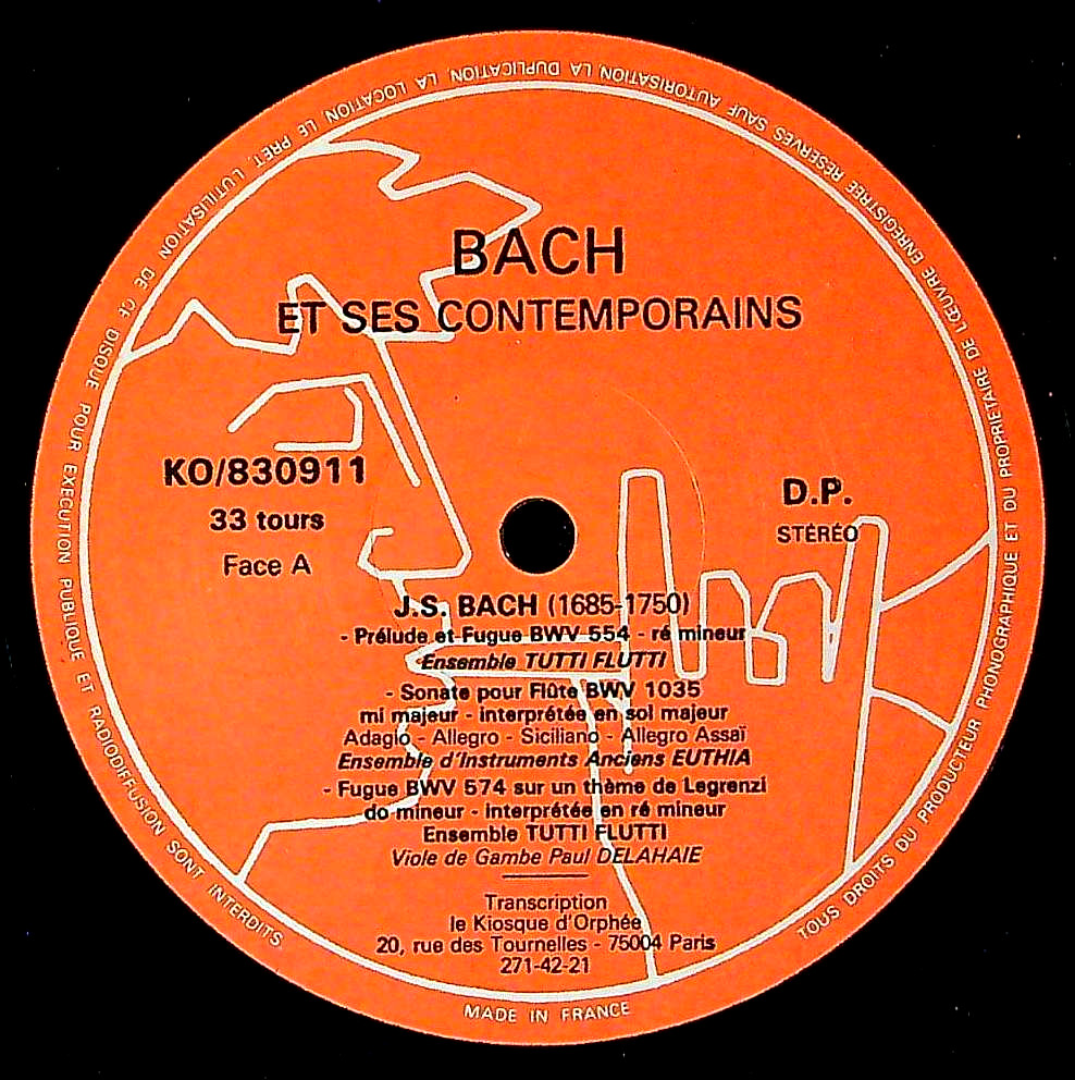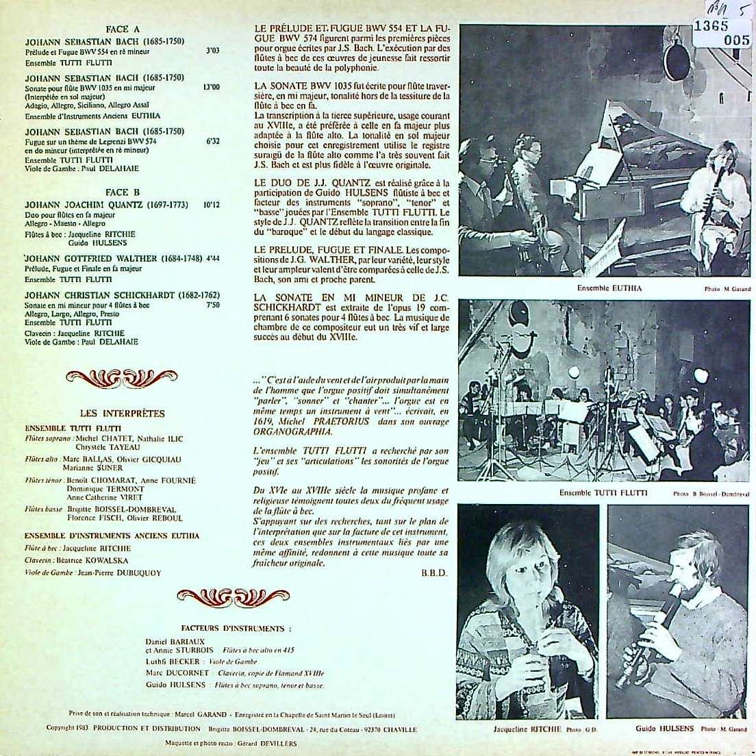 商品詳細:1980年代に入っての録音で古くはないが、当社初入荷の希少なタイトルである。A面にバッハ3曲。1/3曲目はオルガン・ソロのための原曲を、2曲目はフルート・ソナタが原曲の作品を室内アンサンブル用に編曲している。B面はクヴァンツ、J.G.ヴァルター、J.C.シックハルトの3人のバロック期の3作品をやはり室内アンサンブルで演奏している。バッハの2曲目のB.1035の編曲以外はトゥッティ・フルッティEmsという、全員がフルート属を使う13人の団体が演奏。曲により、そこにチェンバロやガンバが加わる。B.1035の編曲だけユーシア古楽Ens.が担当。この団体はリコーダー(ブロック・フレーテ)、チェンバロ、ガンバの3人からなる団体で、すなわちフルート・ソナタB.1035をトリオ・ソナタの形で演奏している。トゥッティ・フルッティEms.は全員がフルート属を使う変わった団体で大半が古楽器を使用しているようである。使用するフルートはソプラノ・フルート3人、アルト・フルート3人、テノール・フルート4人、バス・フルート3人という構成。通常の室内楽ではほとんど使用されない音域の古楽器が登場する。クヴァンツの作品はリコーダー2台だけで演奏される2重奏曲でトゥッティ・フルッティEms.のメンバーではない、リコーダー(ブロック・フレーテ)奏者の2人、ジュード・ハルセンとチェンバロ兼任のジャクリーヌ・リッチーが外部から参加している。フルート好きには魅力ある演奏形態だろう。レーベルは超が付くマイナーなので2度目が入荷する期待は薄い珍品である。