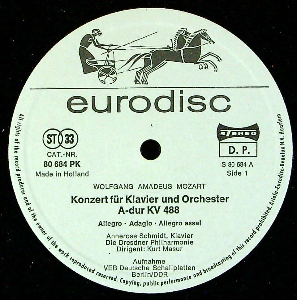 商品コード:REG-4031n[蘭EURODISC] A.シュミット(pf) / モーツァルト:Pf協奏曲23番K.488, 12番K.414