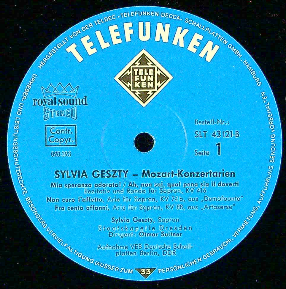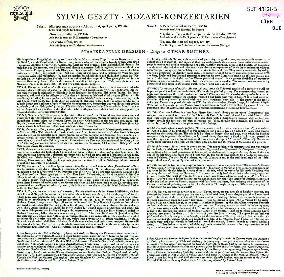 商品詳細:S.ゲスティのモーツァルト・コンサートアリア集はドレスデンにて1960年代にETERNAで録音された。テスト盤が製造されたことまでは解かっているが、正規発売はされず、そのまま幻のLPとなってしまった。恐らくTELEFUNKEN=ETERNAの共同制作であったと思われ、TELEFUNKEN側では1970年にSLT 43121にて発売されたものが当盤である。時期的にTELEFUNKENに黒/銀Royal Sound Stereoレーベルは存在しない。歌手は特に器楽奏者と異なり、唯一無二の存在であり、代役がきかない音楽家である。別の歌手が同じ曲を歌っても全く別のものになってしまう。日本でも人気のコロラトゥーラ・ソプラノ、シルヴィア・ゲスティ(1934-2018)はハンガリー・ブダペスト生まれのソプラノ歌手。リスト音楽院で学び、1960年の「ロベルト・シューマン国際音楽コンクール」で3位に入賞、1961年に東独時代のベルリン国立歌劇場にデビュー、ベルリンのコーミッシェ・オーパーにデビューした。その後、ベルリンを中心に活動。オトマール・スウィトナー、クルト・マズアなどの東独の指揮者と数多く共演、録音を続けた。1970年、シュトゥットガルト歌劇場のメンバーとなったことで西側の歌劇場への出演が増え、ミュンヘンのバイエルン州立歌劇場を中心に、ハンブルク、パリ、ブリュッセル、モスクワ、アムステルダム、ロンドン、ブエノスアイレス、ロサンゼルス、ウィーンなどへ活躍の場を広げた。特に「魔笛」の夜の女王役は絶賛された。東側に何点か録音があり、そのどれもが素晴らしい。彼女の魅力がどのレーベルよりも煌びやかに表れている。コロラトゥーラ・ソプラノの妙技が味わえる高音質録音である。日本では特に人気が高い。ゲスティには特徴があり、響きを重視した歌唱法である。その響きは明るく、ハイ・ソプラノである。フォルテでは声がやや喉声気味になる点以外はスムースでコロラトゥーラだろう。ゲスティはこの響きを優先したため、発音の明瞭さを犠牲にしているというプロの指摘がある。しかしこの発音をもゲスティの個性と捉えればそれさえ魅力となるのである。この特徴を持つソプラノは少ない。そこがゲスティを唯一無二のソプラノ歌手としているのである。