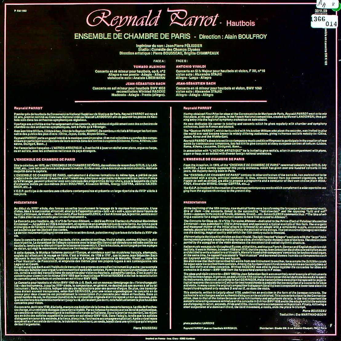 商品詳細:1982年発売の古い録音ではないが、オーボエ奏者、レイナール・パローを中心とした協奏曲集。A面にアルビノーニとバッハのオーボエ協奏曲。バッハは原曲がCemb協奏曲第5番でW.ラデケがオーボエ用に編曲したものである。B面はオーボエとVnの協奏曲が2曲、ヴィヴァルディとバッハ。バッハはよく演奏される2Cemb協奏曲1番が原曲である。オーボエ奏者のレイナール・パローはパリ音楽院を卒業。22歳で音楽院のコンクールで優勝した経歴を持つ。マルセル・ランドウスキにより創設されたオーケストラでオーボエ奏者として活動を開始した。その後弟でリコーダー奏者のウイリアム・パローとパロー四重奏団を組んで各地で公演を行った。特に現代作品を得意としている。指揮者アラン・ブルフロワはフランス人でフランスのCALLIOPEに多くの録音を行っている。その際はチェコスロバキア室内o.プラハを振っているがここではパリ室内ens.を振る。アラン・ブルフロワに関する情報はない。リステンパルトにも似た、粒立が良く、音が立っているように感じる見事な秀演。弱音の音抜きが特徴的で、適度な緊迫感と穏やかさが同居した素晴らしい演奏である!オーボエ奏者パローの音はやや硬めで音の通りが良い。全体の哀愁が漂う音色であり、1960年代的な雰囲気である。表情も抑えているが豊かである。バッハのB.1056におけるソロは素晴らしい!この1曲だけでも聴く価値あり!1982年製造は忘れて良い程の内容を保証する。勿論、音質に関しても全く問題なく、1970年頃のLPと同等!