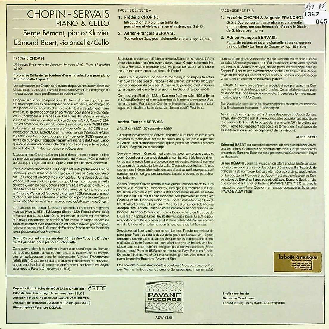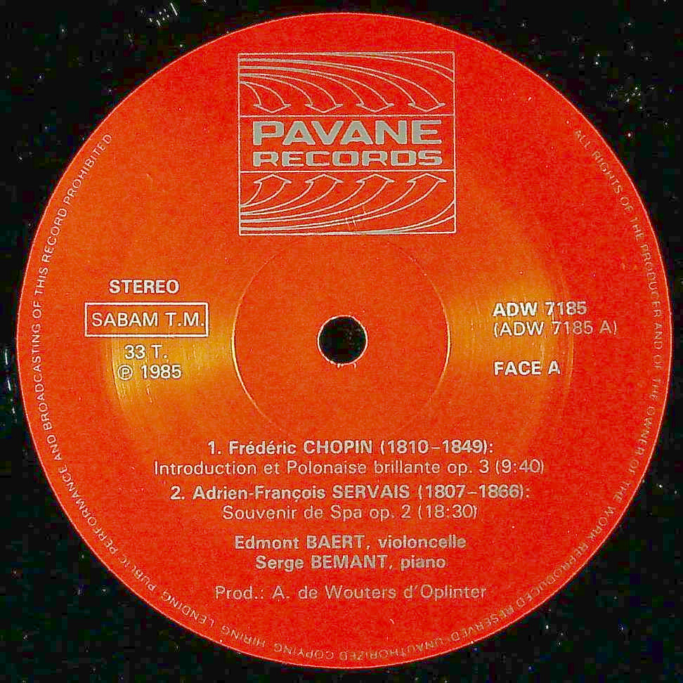 商品コード:1367-045[PAVANE] E.バート(vc) S.ベマン(pf) / ショパン:序奏と華麗なポロネーズOp.3, 大ニ重奏曲, セルヴェ:スパでの思い出 他