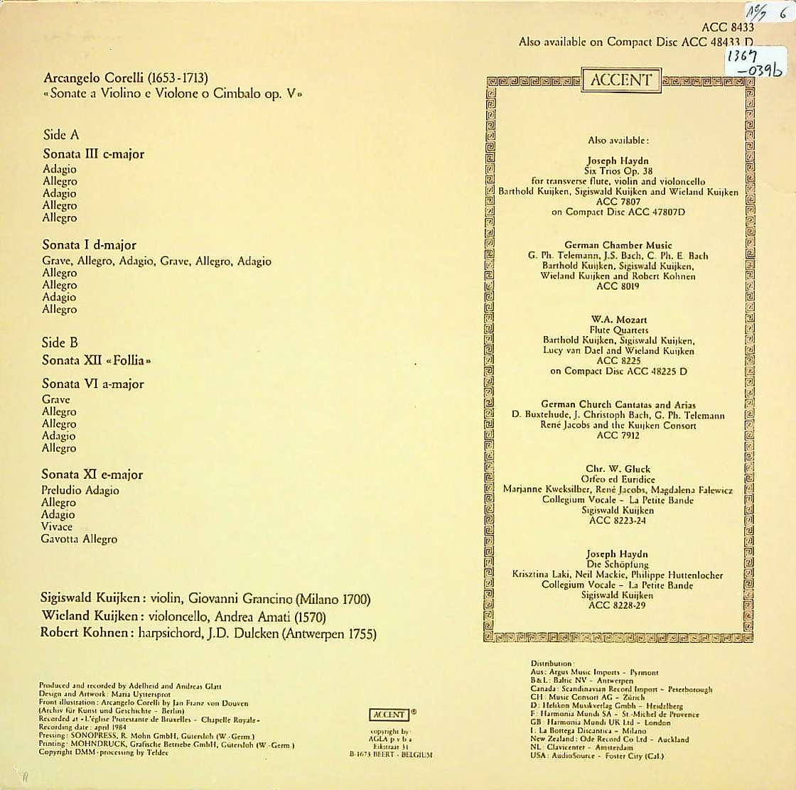 商品コード:1367-039b[ACCENT] クイケン兄弟 他/ コレッリ:VnソナタOp.5-1, 3, 6, 11, 12「ラ・フォリア」