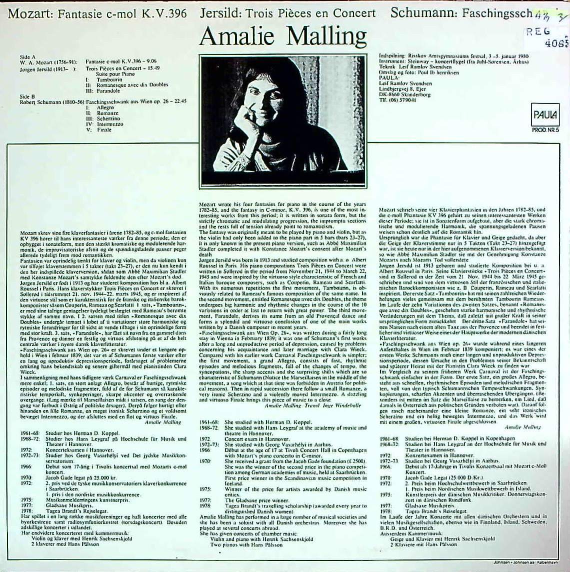 商品コード:REG-4065n[デンマークPAULA] A.マリング(pf) / モーツァルト:幻想曲K.396, イェアシル:Pfのための組曲, シューマン:ウィーンの謝肉祭の道化芝居