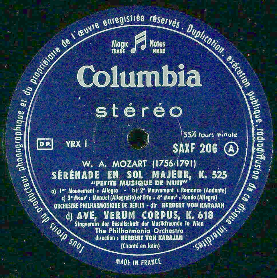 商品詳細:仏ステレオ初出のSAXF 206。すぐ後、SAXF 887で出し直される。これが初出番号で、プレスも厚い。現代の演奏からすると音の切れがいまいちとも言えるが、カラヤンらしい重厚なスタイルを意識した演奏で、今このようなタイプの演奏は無くなった。フルオーケストラを使った贅沢な内容である。現代では小編成で演奏され、すっきりしたタイプが好まれるが、このような厚ぼったい雰囲気もオールドファンには懐かしい。ウィーン楽友cho.を使ったアヴェ・ヴェルムも入り、盛り沢山。アヴェ・ヴェルム・コルプスK.618はカラヤン唯一の録音で、ウィーンでベートーヴェン交響曲9番を録音した時期のモノラル録音らしい。聴いた限りでは真正ステレオのように感じられた。この後1985年バチカンのサン・ピエトロ大聖堂でのライヴでのデジタル録音まで唯一の録音だった。短い曲だけに録音されたまま放置されて、これまでLP化されなかった音源である。これをこのLPに無理に入れた感は否めないものの、カラヤンがウィーンに遠征したフィルハーモニアo.と現地のウィーン楽友協会合唱団との共演という二度とあり得ない状況での音源だけに興味深い。このLPでしか聴けない貴重な録音である。他の曲は全て1959年と1960年ベルリンでのベルリンpo.を振ったもの。ベルリンpo.との古い英COLUMBIA録音も多くないだけにカラヤン好きには欠かせない一枚と言える。