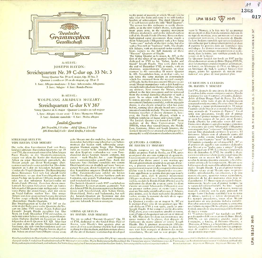 商品コード:1368-017[DGG] ヤナーチェクQt. / ハイドン:弦楽四重奏曲39番Hob.III.39, モーツァルト:弦楽四重奏曲14番K.387