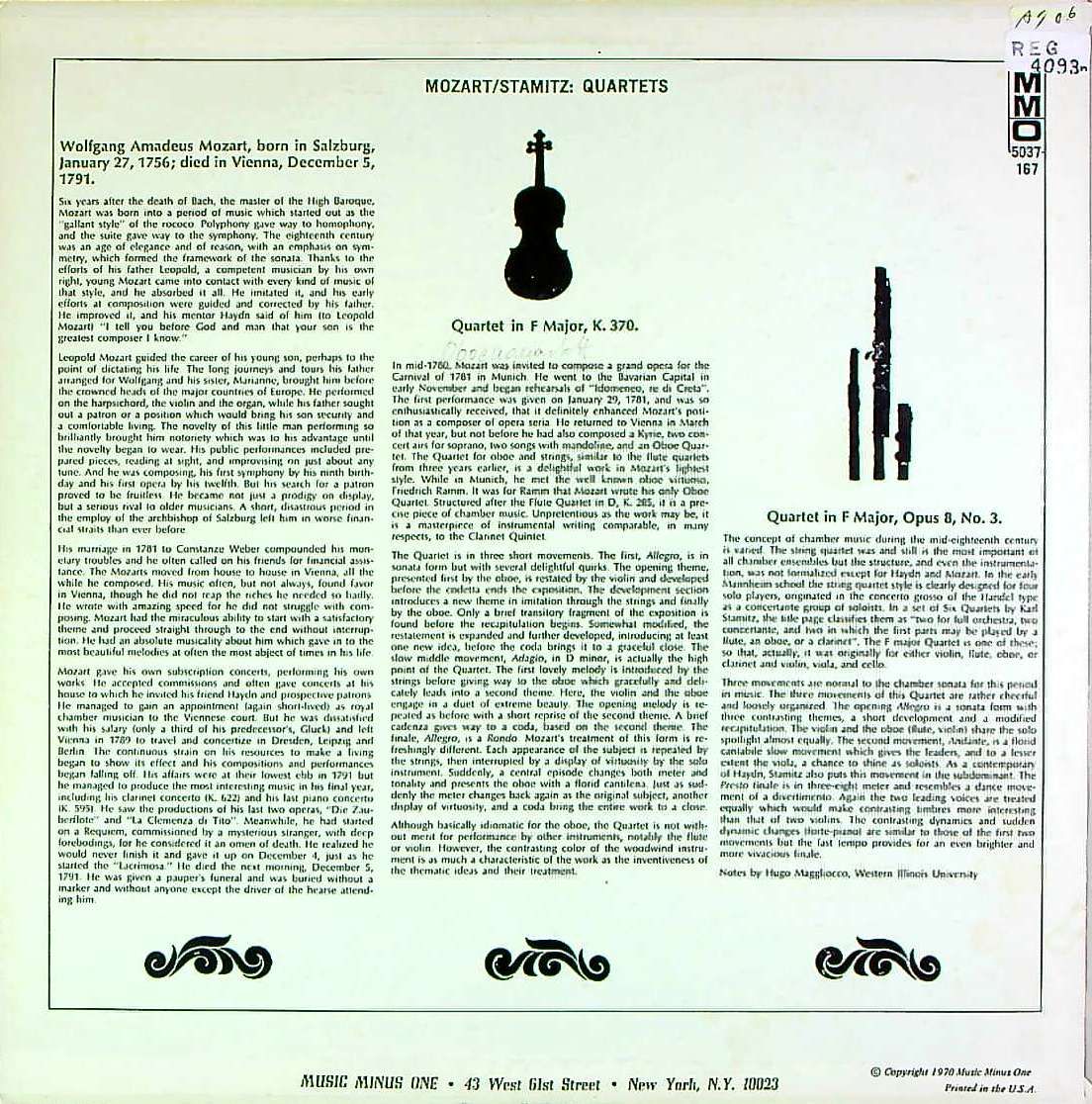 商品コード:REG-4093n[米Music Minus One] ミュージック・マイナス・ワンQt. / モーツァルト:Ob四重奏曲K.370, シュターミッツ:Ob四重奏曲