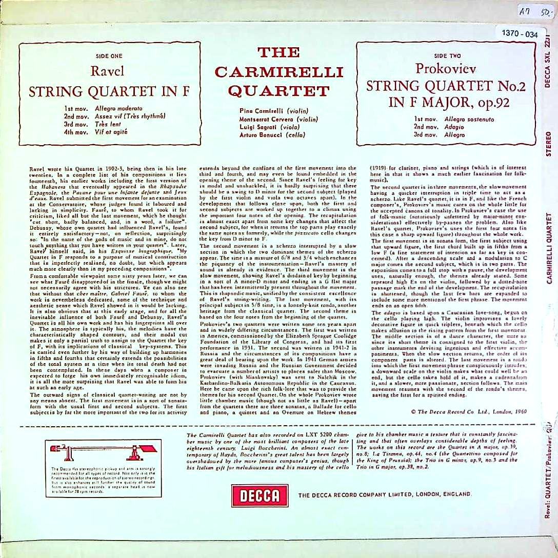 商品コード:1370-034[DECCA] カルミレッリQt. / ラヴェル:弦楽四重奏曲 ヘ長調, プロコフィエフ:弦楽四重奏曲2番Op.92
