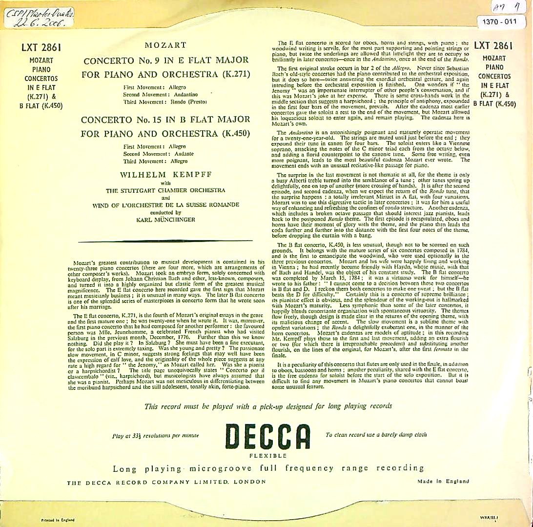 商品コード:1370-011[DECCA] W.ケンプ(pf)/ モーツァルト:Pf協奏曲9番K.271, Pf協奏曲15番K.450