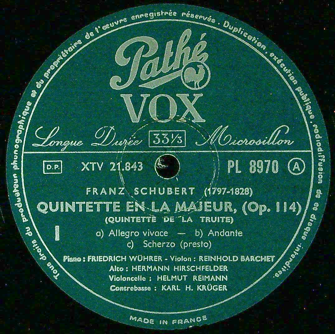 商品コード:1371-058[Pathé-VOX] F.ヴューラー(pf) バルヒェットQt.メンバー/ シューベルト:Pf五重奏曲「鱒」, Pf三重奏曲「ノットゥルノ」