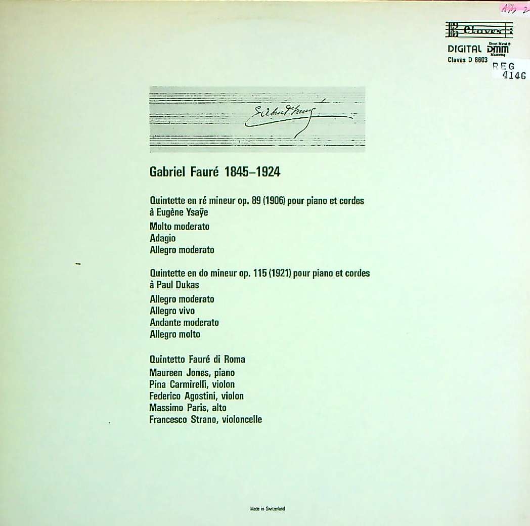 商品コード:REG-4146t[CLAVES] ローマ・フォーレ五重奏団 / フォーレ:Pf五重奏曲1番, 2番