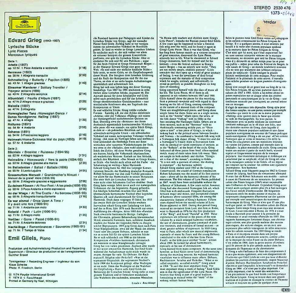 商品コード:1373-064nb[DGG] E.ギレリス(pf) / グリーグ:抒情小曲集(全10巻/66曲)~抜粋20曲