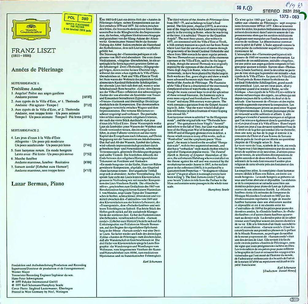 商品コード:1373-063[DGG] L.ベルマン(pf) / リスト:「巡礼の年」全集Vol.3/第3年(全7曲)