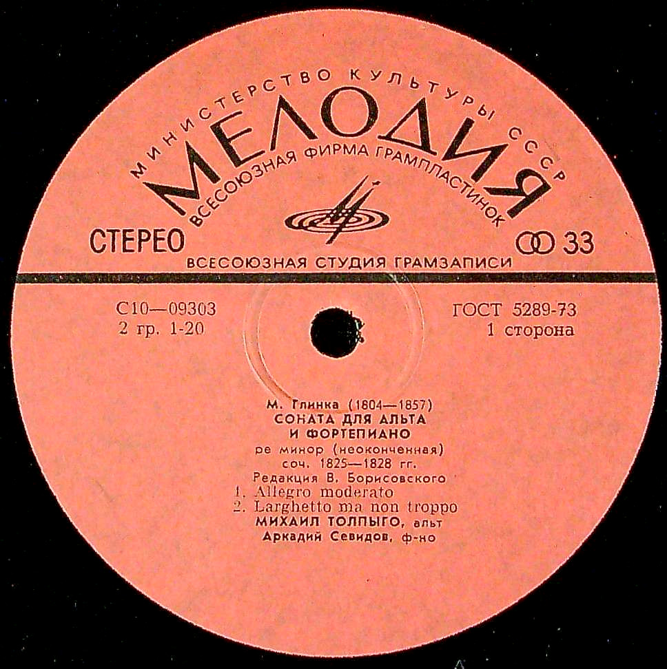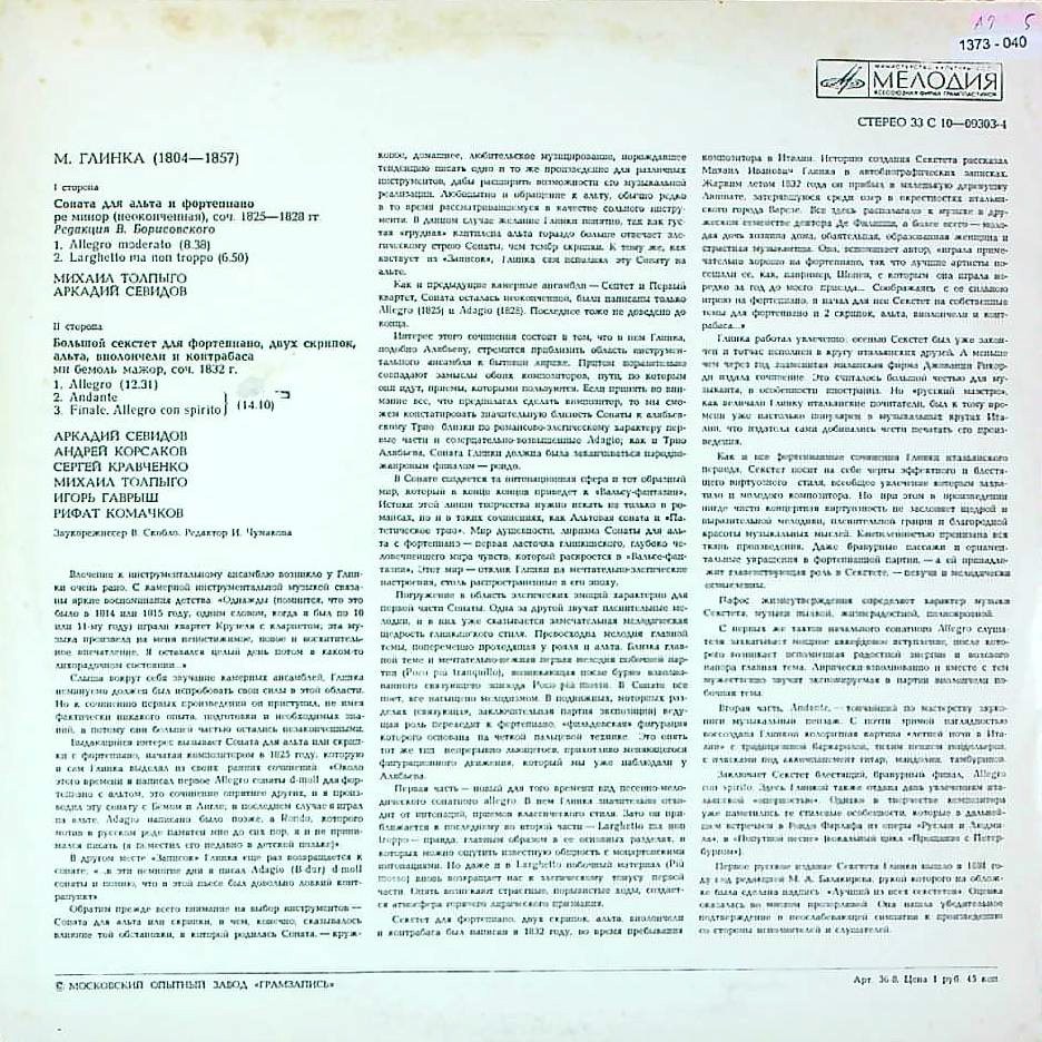 商品コード:1373-040t[MELODIYA] M.トルピーゴ(va) 他/ グリンカ:Vaソナタ ニ短調(ボリソフスキー補筆版), 大六重奏曲