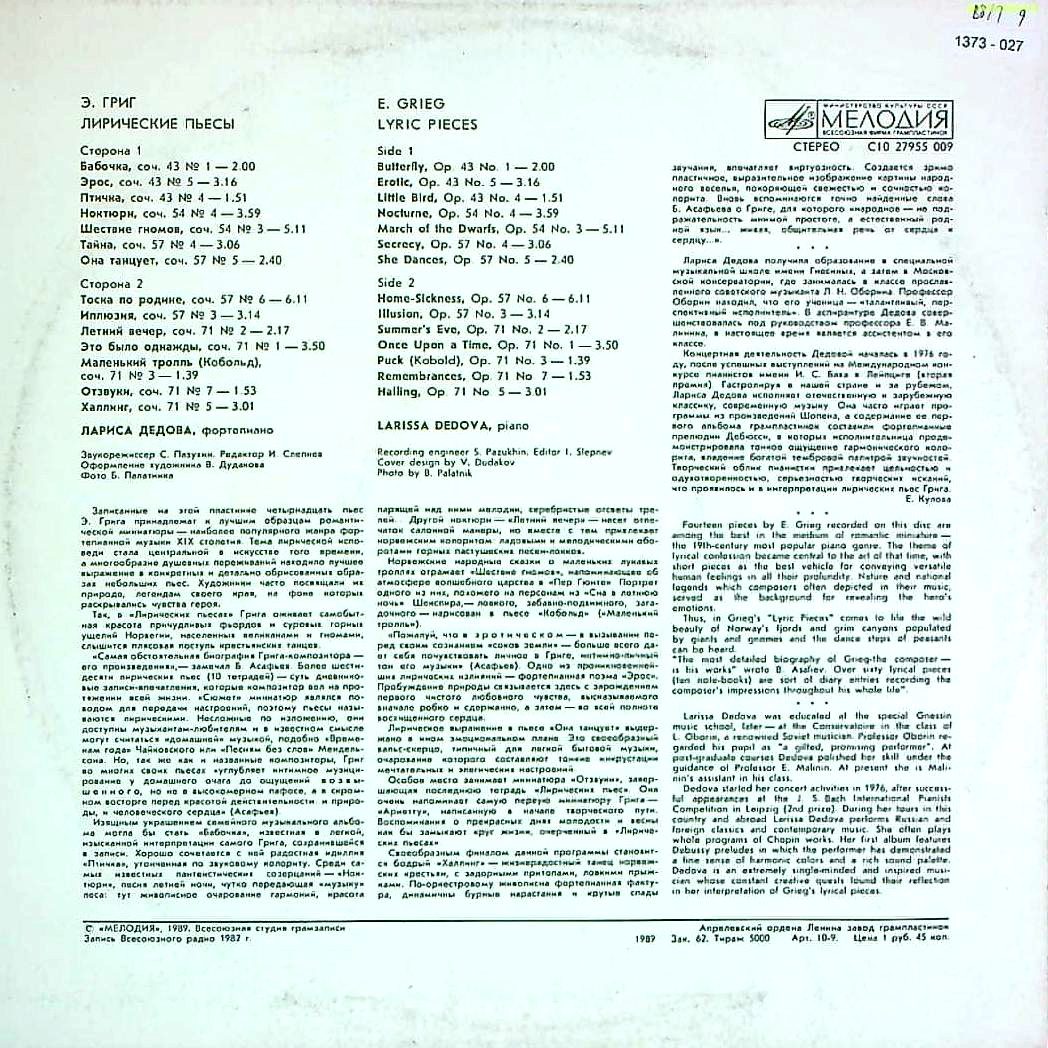 商品コード:1373-027n[MELODIYA] L.デードワ(pf) / グリーグ:抒情小曲集(全10巻/66曲)~抜粋14曲