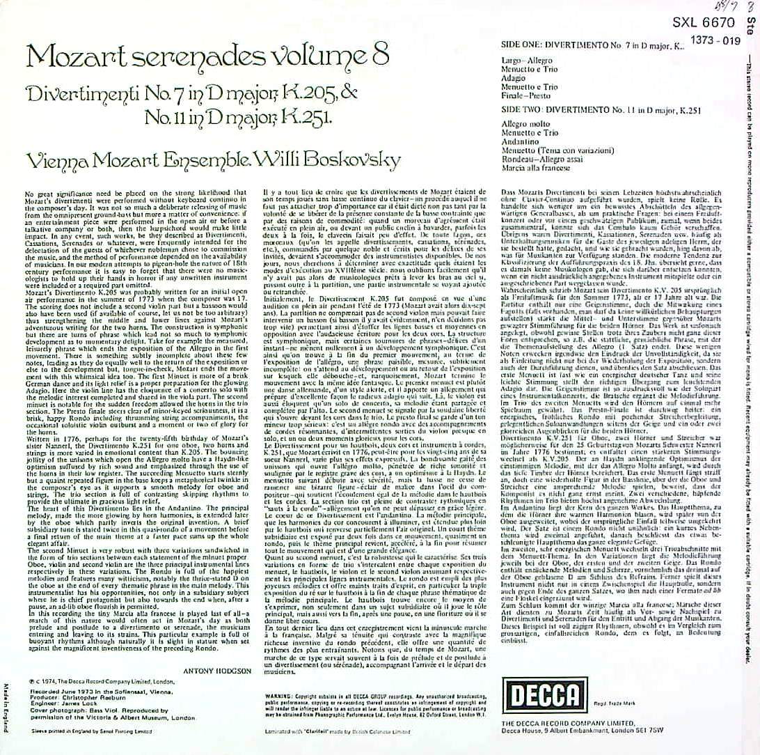 商品コード:1373-019[DECCA] W.ボスコフスキー/ モーツァルト:セレナーデ集Vol.8/ディヴェルティメント7番K.205, 11番K.251