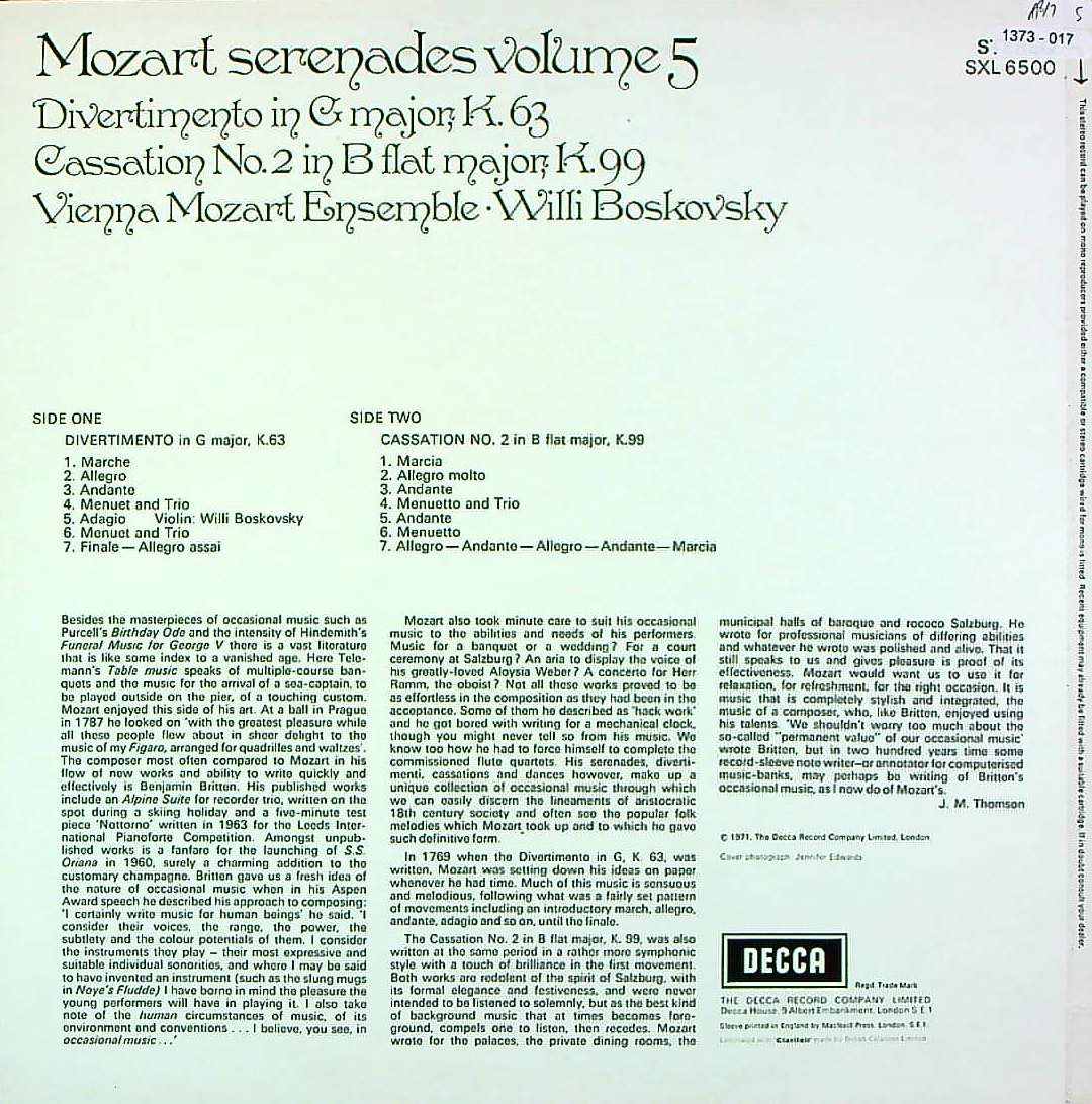 商品コード:1373-017[DECCA] W.ボスコフスキー/ モーツァルト:セレナーデ集Vol.5/ディヴェルティメントK.63「フィナール・ムジーク」, カッサシオン2番K.99「フィナール・ムジーク」