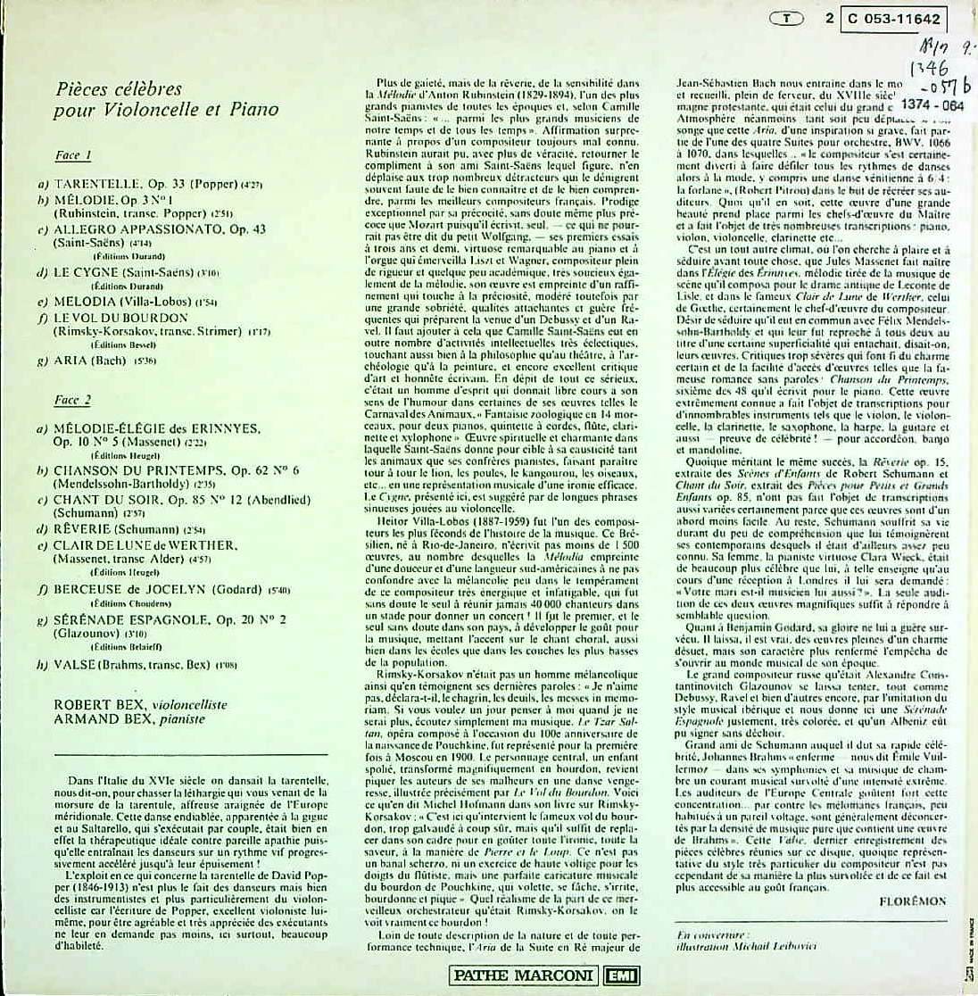 商品詳細:1972年フランスのみの発売のVc小品集。チェロのロベール・ベーとピアノのアルマン・ベーの二人は兄弟。兄のVcのロベールは弟と共に1950年ジュネーブ・国際コンクールで入賞。パリ・ラムルーo.の首席チェリストとして活躍。パリ器楽グループのメンバーであったことは解かっている。パリ器楽グループはおそらくJ.ラフォルジュ(pf)L.ガリ(vn)B.パスキエ(va)R.ベー(vc)の4人ではないかと思われる。日本では「新フランス音楽のエスプリ・シリーズ」とのタイトルでサン・サーンスの室内楽曲集を発売していた。全15曲、名曲揃い。タイトルも「VcとPfの有名な作品」。1972年としては出色の出来、Vcの音は低音まで豊かに出ており、ふくよかな音色。小品を得手とするだけあって、ツボを押さえ、聴かせ所を知っている、但しあまり歌わない。朗々と鳴らすが、シンプルにメロディーを流してなお楽しませる!1970年代録音のVc小品集としては最高ランクの内容!入荷は多くない!当LPのフランス語タイトル:「 Pièces Célèbres Pour Violoncelle Et Piano」。
