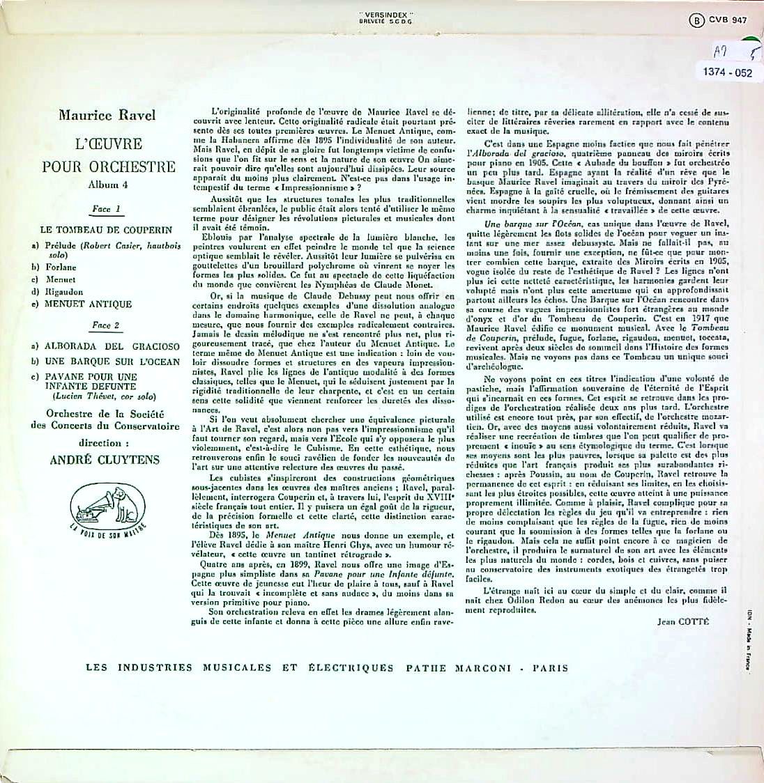 商品コード:1374-052[VSM] A.クリュイタンス/ ラヴェル:管弦楽曲全集Vol.4/クープランの墓, 古風なメヌエット, パヴァーヌ, 道化師の朝の歌, 洋上の小舟