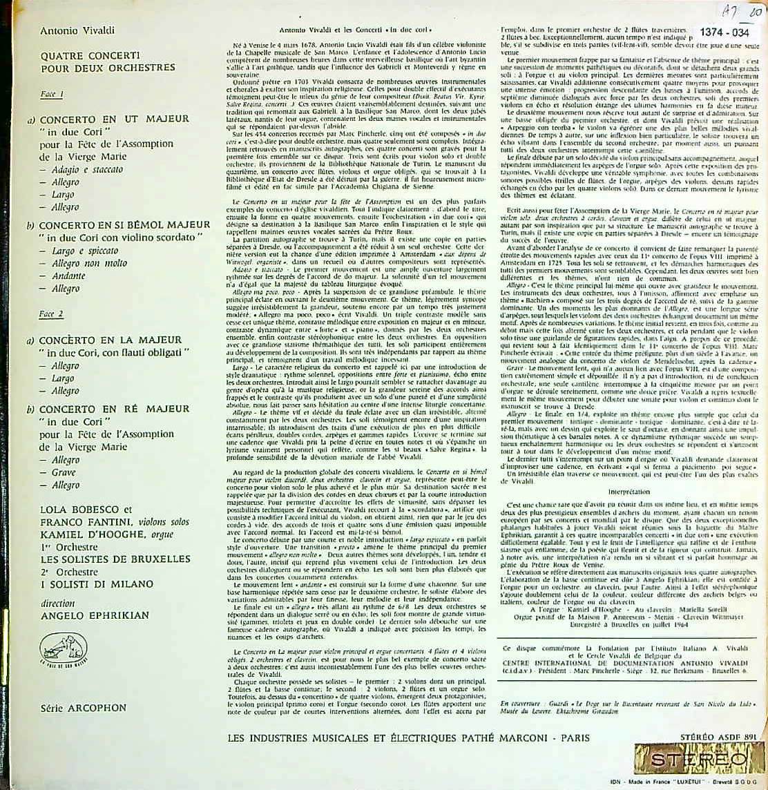 商品詳細:ローラ・ボベスクが参加したブリュッセル・ソリストと、イタリア・ミラノのミラノ・ソリストの混合Ens.と思われる。伊ARCOPHONが音源のようだ。聴けば、ブリュッセルの室内o.を弾き振りしていた頃のボベスクのサウンドそのもの。ソロ部分をボベスクとブリュッセル・ソリストが、そして、バックをミラノ・ソリスト達が担当しているようだ。2つのオケのための協奏曲となっているが、単純に言えば、Vnを主体とした合奏協奏曲のような感じ。全編にわたって、ボベスクのソロが圧倒的で、彼女の為のLPと思って良い。ASDF 891が初出番号。ボベスクの珍しいEMI系録音。イタリア人指揮者アンジェロ・エフリキアンがソリスティ・ディ・ミラノとボベスク率いるソリステ・デ・ブリュッセルの2つの合奏団の合奏で演奏。イタリアで録音されたのかと思っていたが、盤のマトリクスが2YLAなのでフランスで録音された事を意味する為、イタリアとベルギーの両団体がフランスで合流しての録音だったのではと思われる。イタリアからもArcophonレーベルから発売されている。また珍しく英国でも発売された。