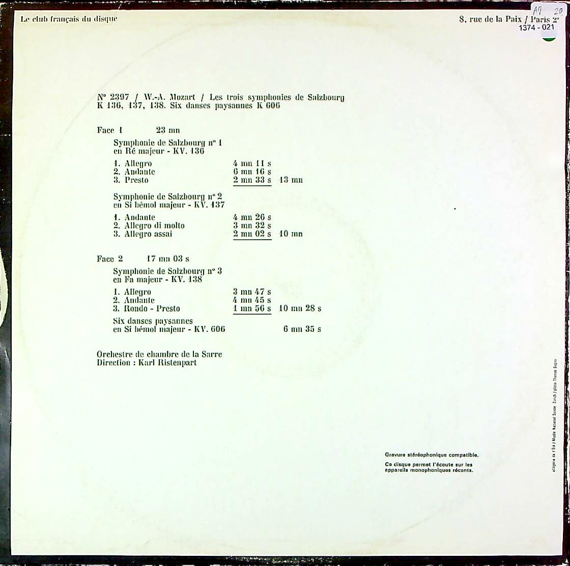 商品コード:1374-021[Club Français] K.リステンパルト/ モーツァルト:ザルツブルク交響曲1~3番