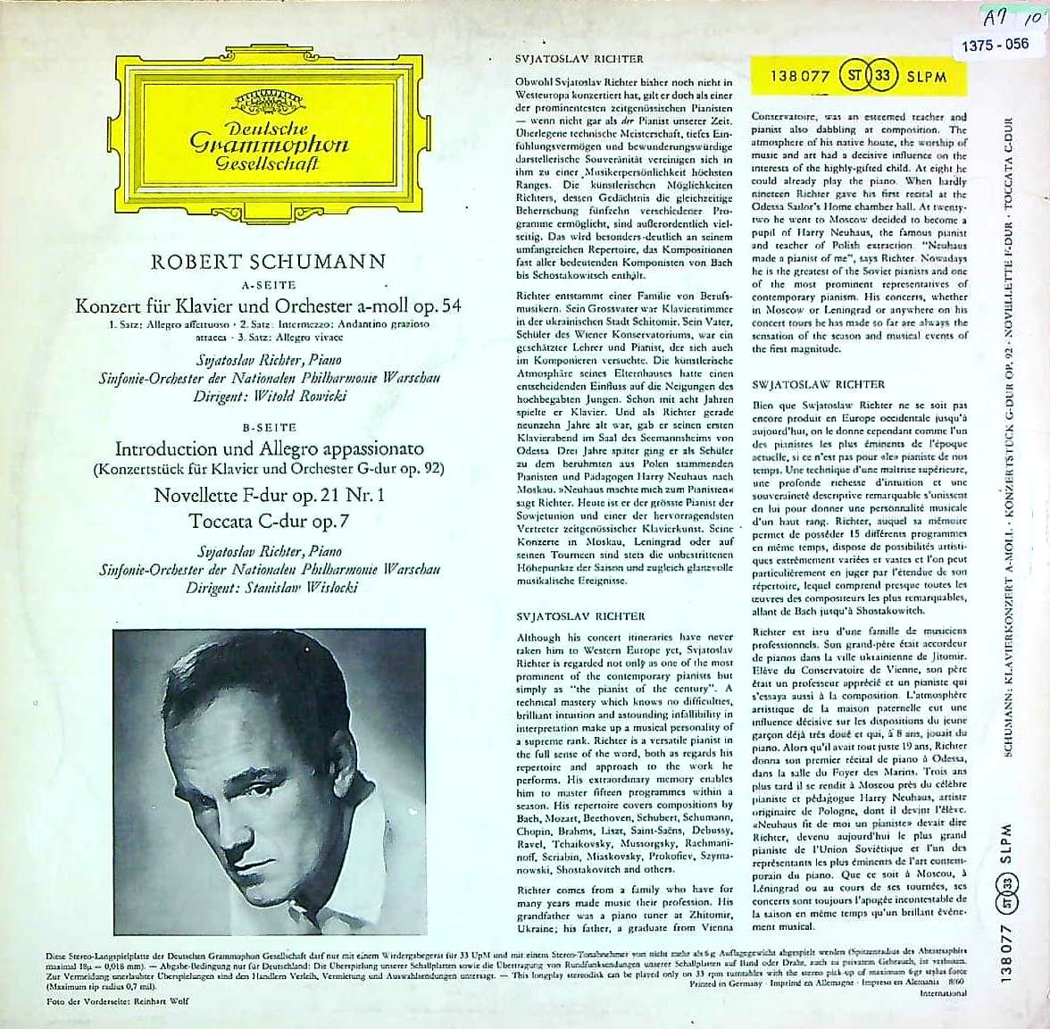 商品コード:1375-056p[DGG] S.リヒテル(pf)/ シューマン:Pf協奏曲, 序奏とアレグロ・アパッショナート, ノヴェレッテ, トッカータ