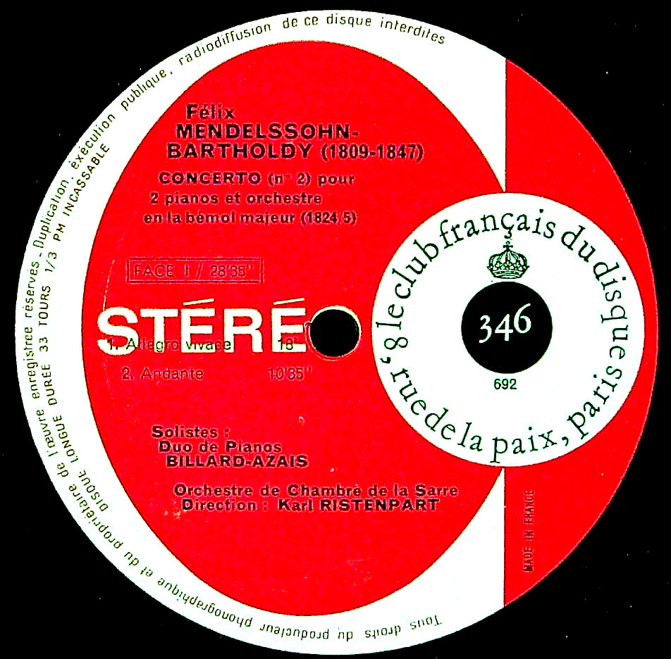 商品コード:1375-036b[Club Français] ビラール・アゼ・デュオ(pf) K.リステンパルト/ メンデルスゾーン:2Pf協奏曲, 序曲「美しいメルジーネの物語」Op.32