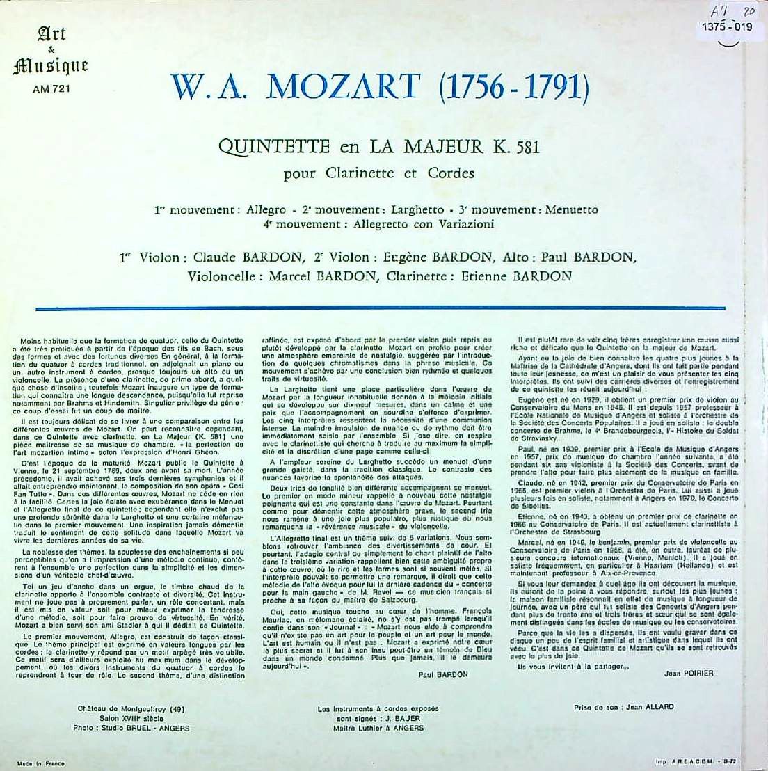 商品コード:1375-019[ART&MUSIQUE] E.バルドン(cl) バルドンQt./ モーツァルト:Cl五重奏曲K.581